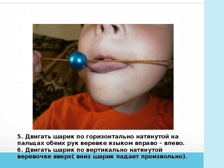 5. Двигать шарик по горизонтально натянутой на пальцах обеих рук веревке языком вправо – влево.