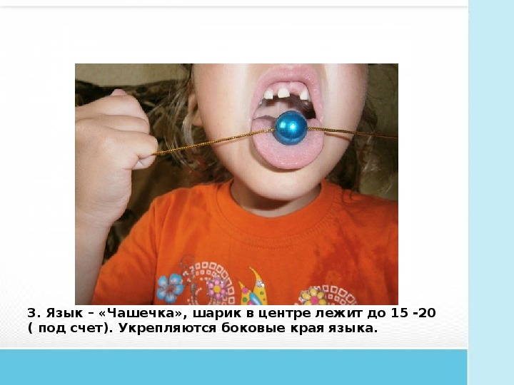 3. Язык – «Чашечка», шарик в центре лежит до 15 -20 ( под счет). Укрепляются боковые края языка.