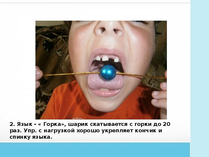 2. Язык - « Горка», шарик скатывается с горки до 20 раз. Упр. с нагрузкой хорошо укрепляет кончик и спинку языка.