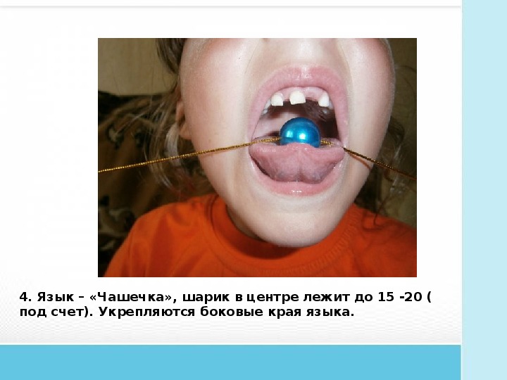 4. Язык – «Чашечка», шарик в центре лежит до 15 -20 ( под счет). Укрепляются боковые края языка.
