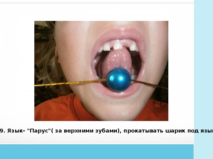 9. Язык- "Парус"( за верхними зубами), прокатывать шарик под языком.