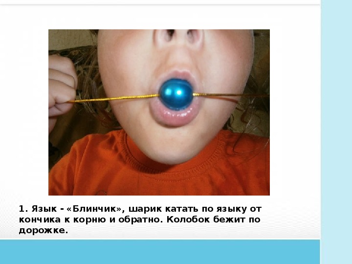 1. Язык - «Блинчик», шарик катать по языку от кончика к корню и обратно. Колобок бежит по дорожке.